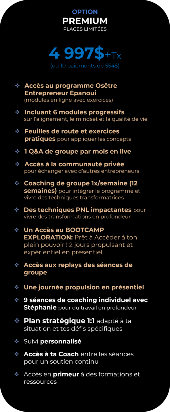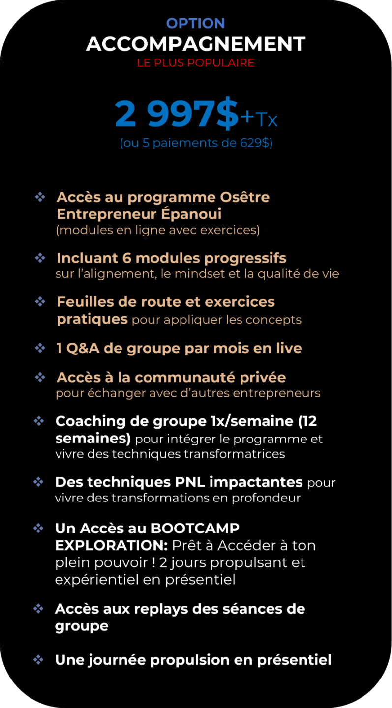 Osêtre Entrepreneur Épanoui, est une transformation guidée de 12 semaines. Plus qu’un programme, c’est un processus qui t’aide à reprogrammer ton mindset, te libérer de tes blocages et t’aligner pleinement entre qui tu es et ce que tu fais.