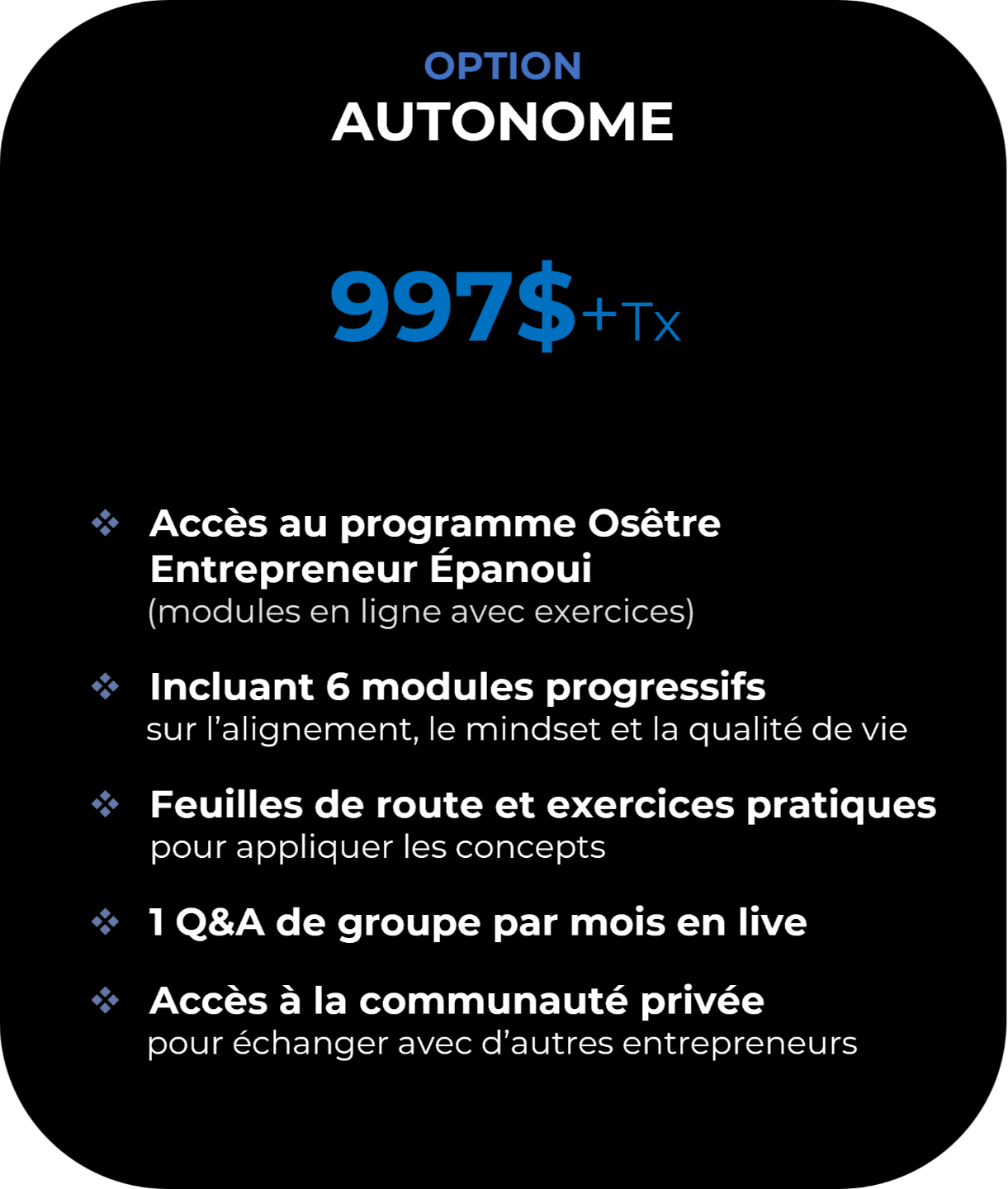 Avec cette option, tu plonges au cœur du programme. Tu as le cadre, le contenu, les exercices, l’énergie du groupe, des exercices guidés virtuel en direct et des immersions en présentiel. Parfait si tu veux un vrai momentum, du soutien et vivre une transformation plus profonde.